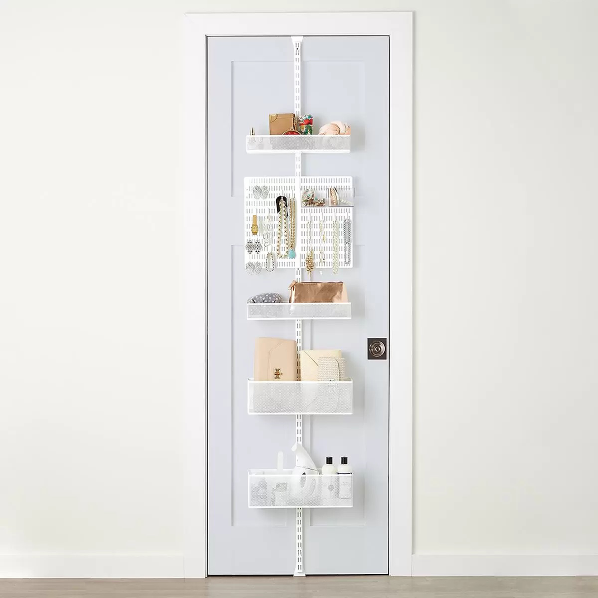 Tip Panas: Bagian dalam pintu lemari anda menawarkan peluang berharga buat mengatur barang-barang yang tidak mudah disimpan. Gunakan satu di lemari aula anda buat handuk ekstra atau kebutuhan griya tangga, atau gantung dompet dan syal pada pengatur dengan pengait.