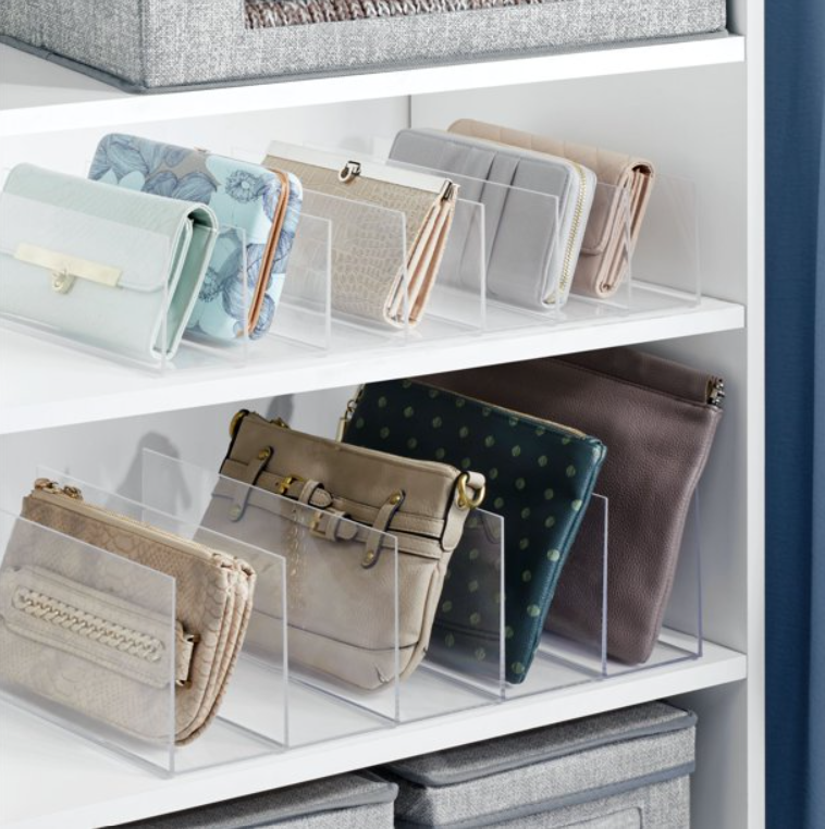 andaikata anda sudah memiliki rak atau sedang berpikir buat memasangnya, tambahkan pembagi plastik praktis ini ke keranjang anda. Letakkan saja di rak anda dan biarkan mereka menambah penyimpanan koleksi tas tangan anda. Lupakan menggantungkannya di pegangan tangga di bagian bawah tangga atau dengan hati-hati menggantungnya di tepi pintu (sesuatu yang saya lakukan sepanjang masa), nampan pengatur dengan pembagi akan segera membantu anda.