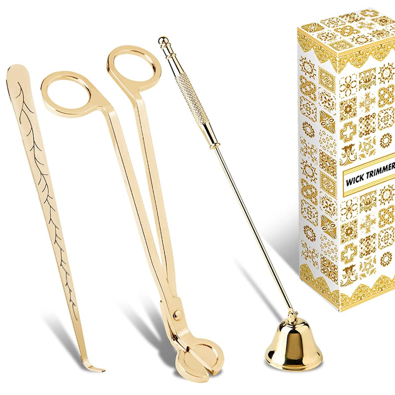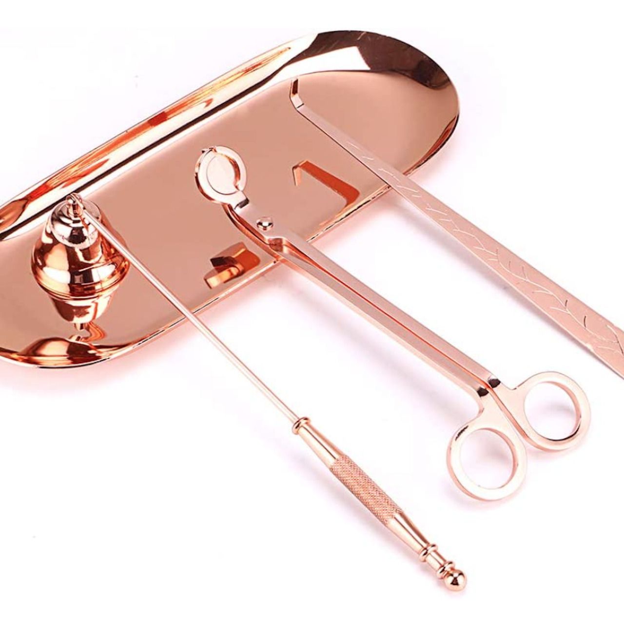 Berikan nomor beraroma lavender anda TLC yang sangat dibutuhkan. Set baja tahan karat berwarna sampanye emas ini dilengkapi dengan pemangkas, snuffer, dan sendok sumbu, semuanya dirancang untuk memastikan lilin anda memperkuat selama mungkin.