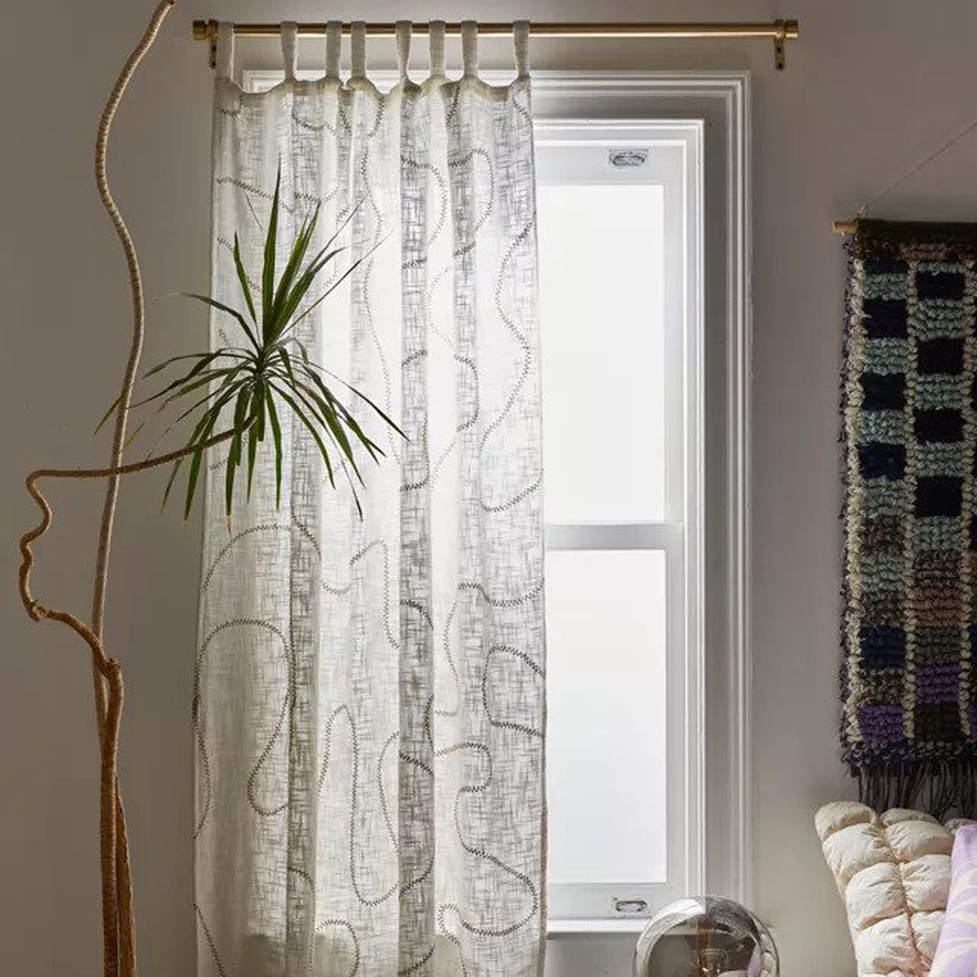 Apartemen lantai bawah saya sempit dan gelap, jadi saya memilih panel kain kasual berukuran penuh dengan lapisan tipis sedang untuk memberikan ilusi ketinggian tambahan sekaligus menciptakan tampilan dan nuansa yang lapang. (Faktanya, mereka persis dari H&M, seperti yang tercantum di bawah ini.)