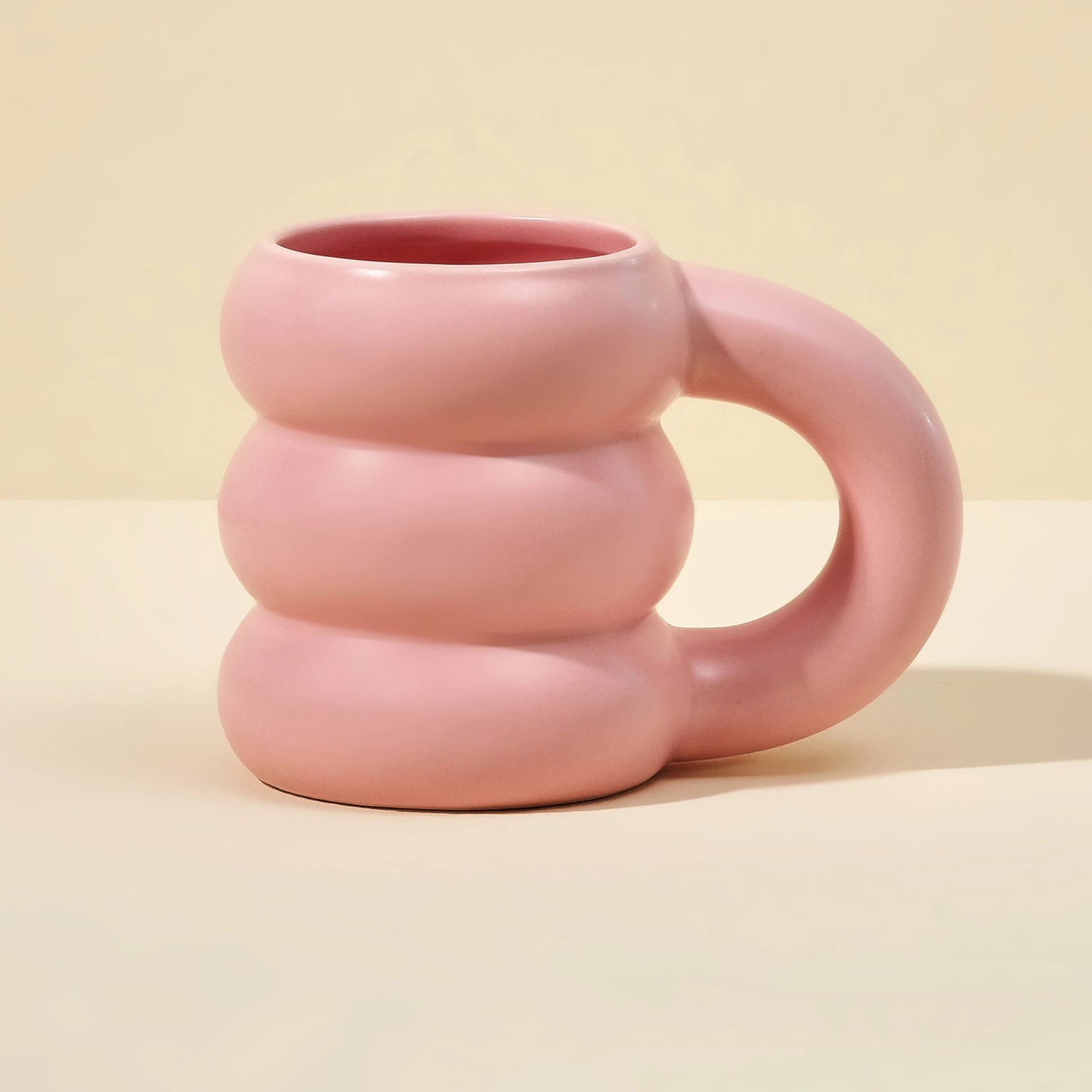 Mug bergelembung yang menyenangkan ini tersedia dalam warna hijau matcha, mawar, lavender, dan putih. Rusuk dan ciptaan gagangnya yang tebal sangat mirip dengan pelek tebal yang terlihat pada set pelat Djerf.