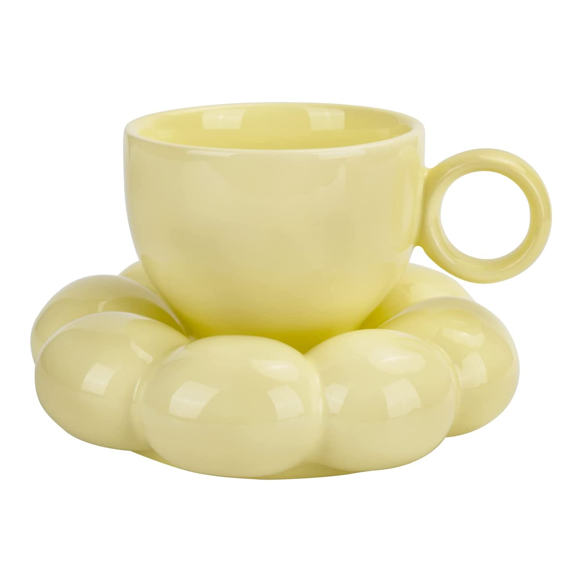 jika dirimu mau menambahkan sentuhan halus pastel Denmark ke peralatan minum dirimu dan mencerahkan secangkir kopi pagi dirimu, cangkir dan tatakan berbentuk bunga mentari dengan warna kuning lemon yang ceria ini cocok untuk dirimu.